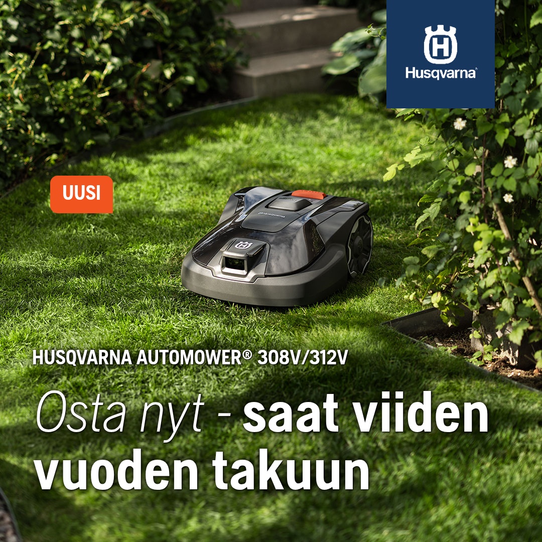 Osta Automower® 308V tai Automower® 312V 16.2.2026–30.4.2026 välisenä aikana ja rekisteröi se Automower® Connect -sovelluksessa viim. 31.5.2026 saadaksesi 5 vuoden takuusuojan ilman lisäkustannuksia.Lisätietoja saat myymälästämme!